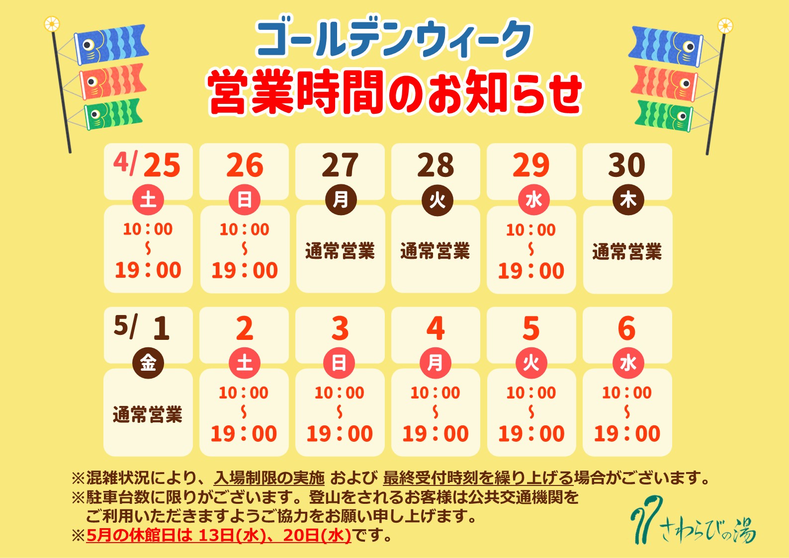日頃より当館をご利用いただき誠にありがとうございます。ゴールデンウィーク期間中の営業は下記の通りです。
