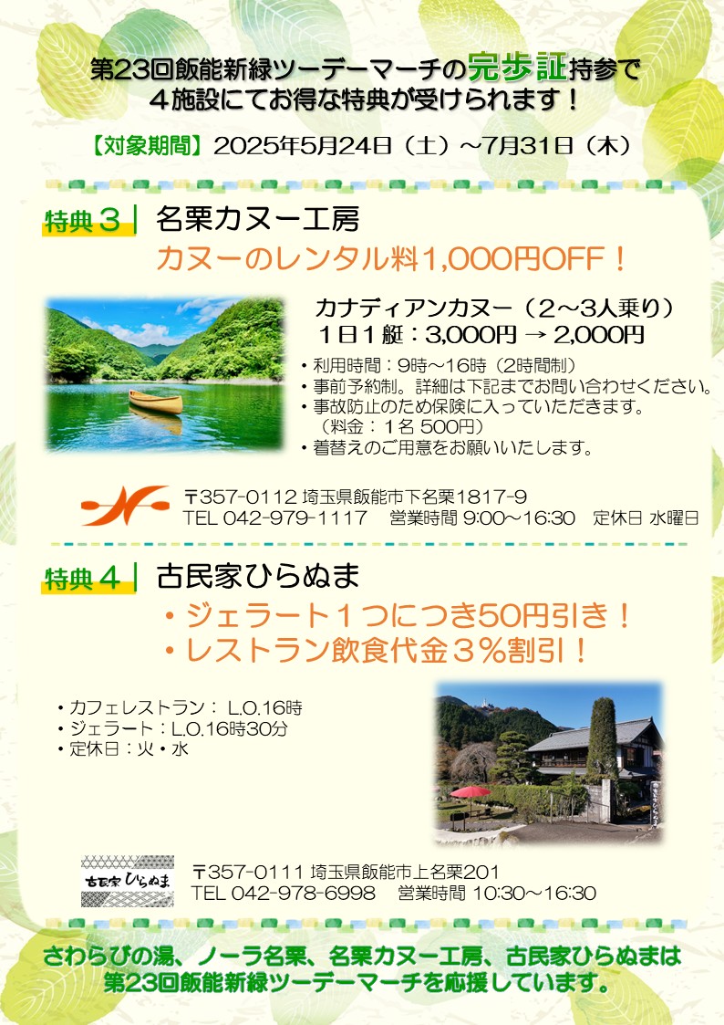 また、ノーラ名栗、名栗カヌー工房および古民家ひらぬまにおいても下記特典がございます。ぜひ、この機会に完歩証をお持ちになって名栗地域にご来訪ください。