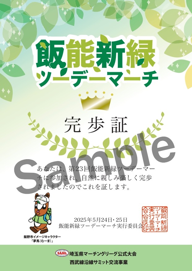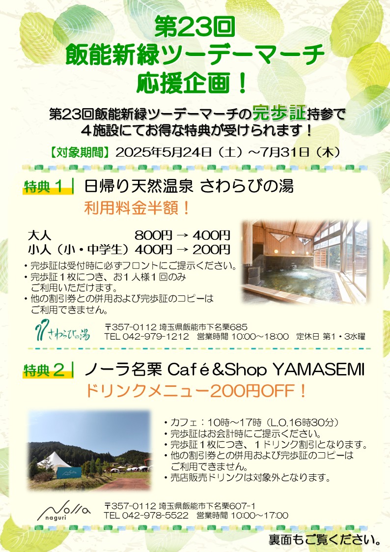 2025年5月24・25日(土・日)に開催されます“第23回飯能新緑ツーデーマーチ”応援企画として、完歩証を期間内に持参してご来館されますと、通常の利用料金の半額でご利用いただけます。